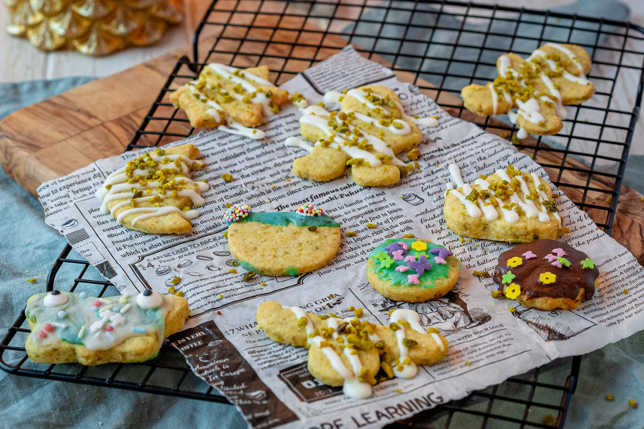 Der Teig ist schnell gemacht, lässt sich gut ausrollen und klebt nicht — perfekt zum Ausstechen. Kinder können problemlos mithelfen beim Formen und Verzieren. Nach dem Backen werden die Kekse mürbe und schmecken leicht nussig nach Pistazien. Zum Rezept für Pistazien Plätzchen hier klicken.