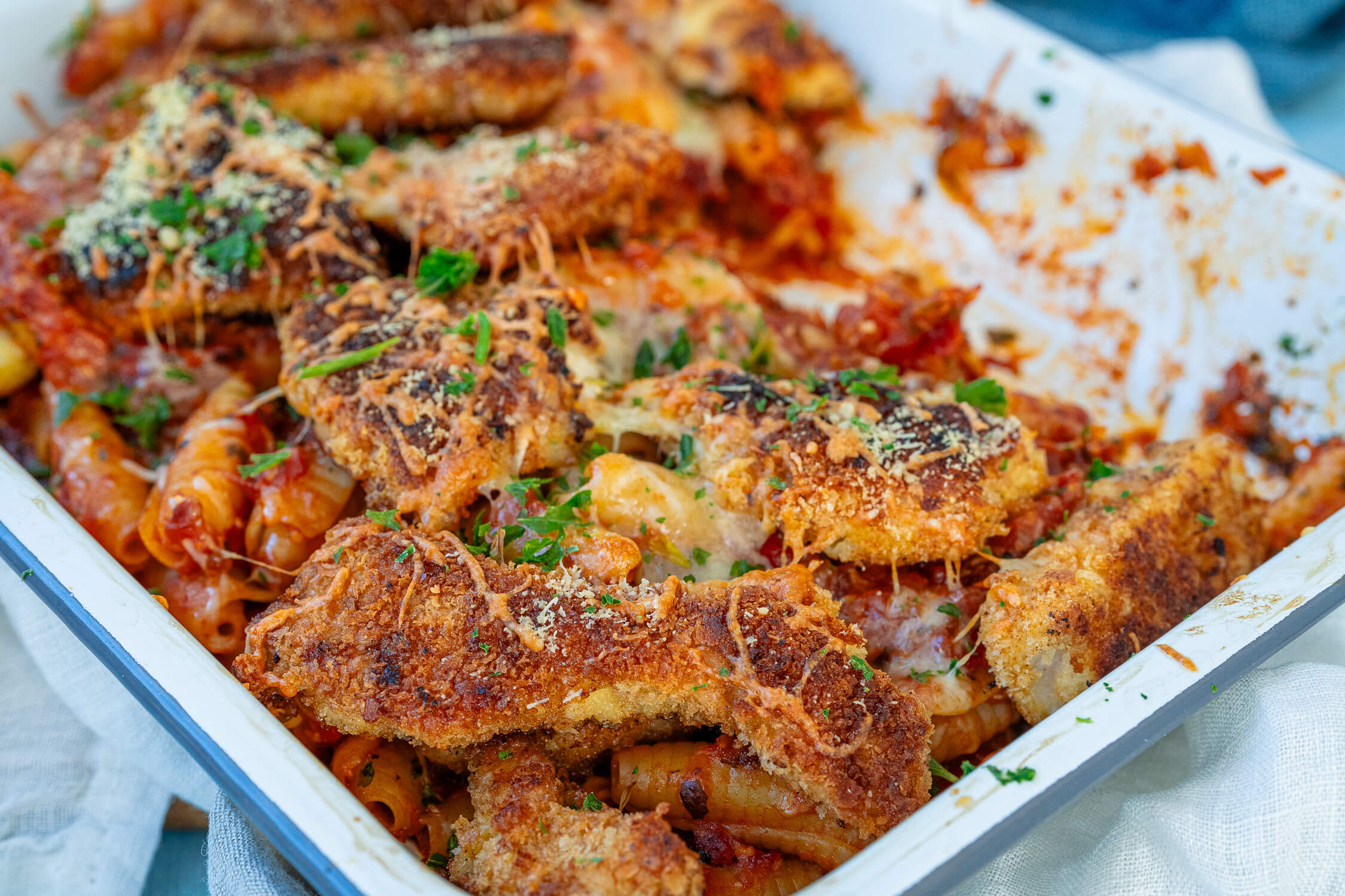 Dieser Auflauf kombiniert knusprig paniertes Hähnchen mit Nudeln, Tomatensoße, Parmesan und Mozzarella – ein richtiges Wohlfühlessen. Die Zubereitung ist unkompliziert und ideal für einen gemütlichen Abend mit der Familie. Zum Rezept für Parmesan‑Hähnchen‑Auflauf hier klicken.