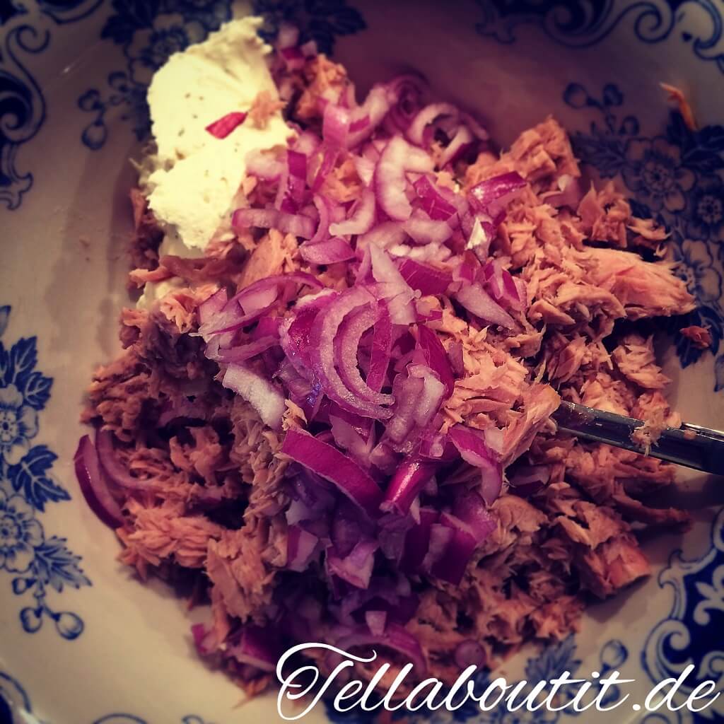- Den Frischkäse mit Kräutern und den Thunfisch verrühren, ich zupfe den Thunfisch immer vorher mit einer Gabel auseinander.