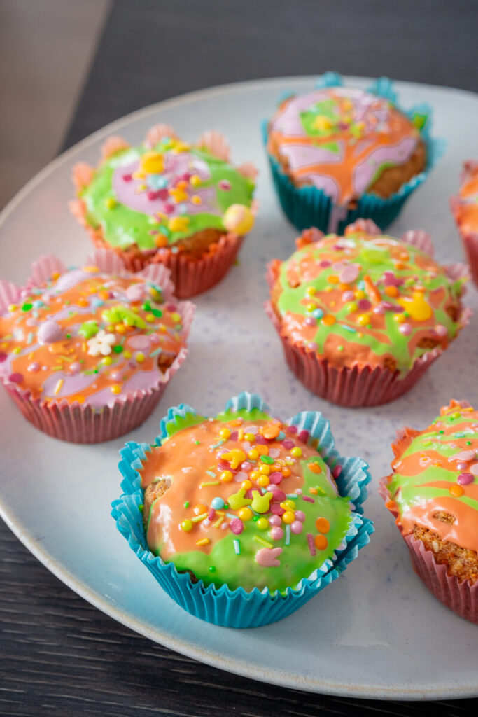 Gerade zu Ostern finde ich diese Muffins eine richtig schöne Alternative zum klassischen Karottenkuchen – besonders für Kinder. Mit Frischkäse-Topping sind sie natürlich ein absoluter Traum, aber meine Kinder mögen Schokolade viel lieber. Deshalb ist die Variante mit eingefärbter Schokolade und bunten Oster-Streuseln einfach perfekt.