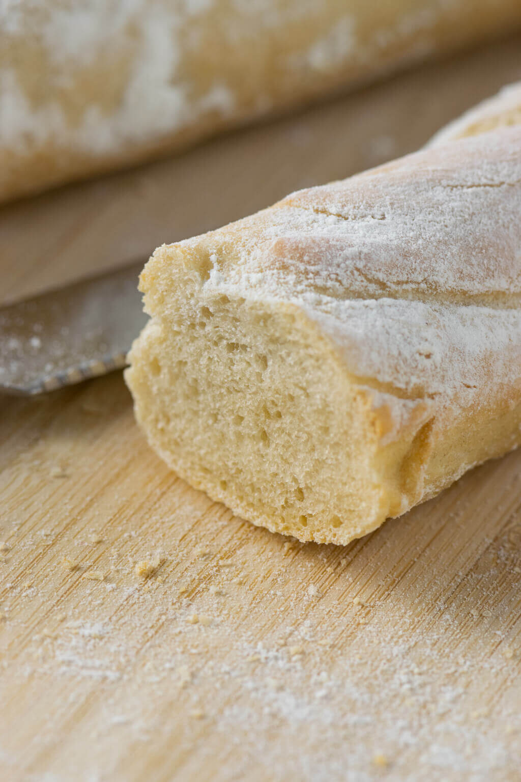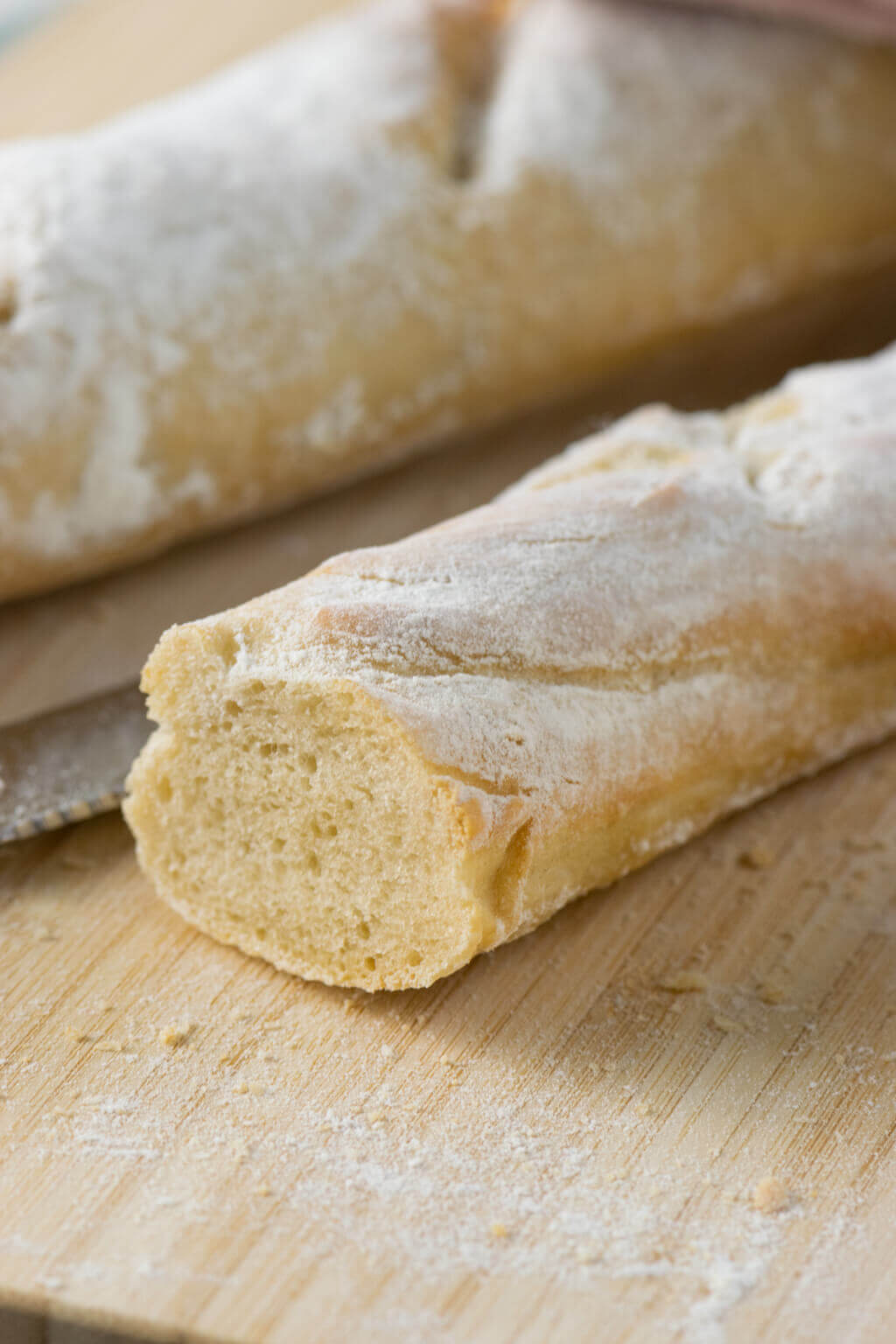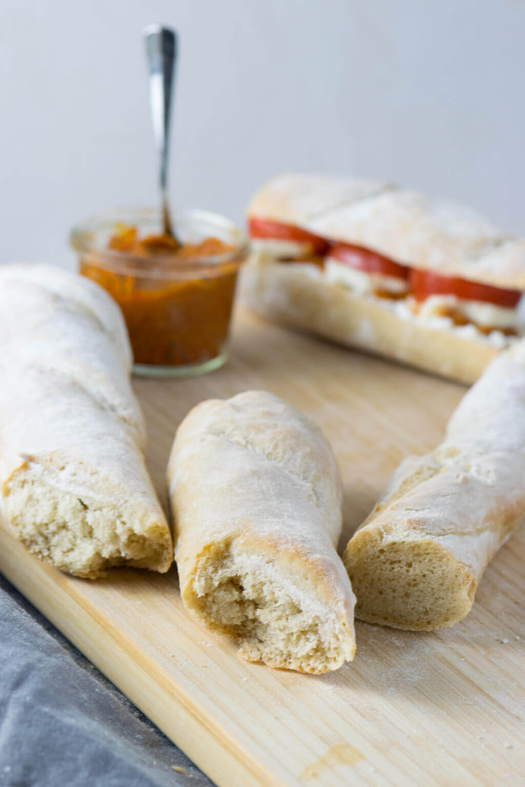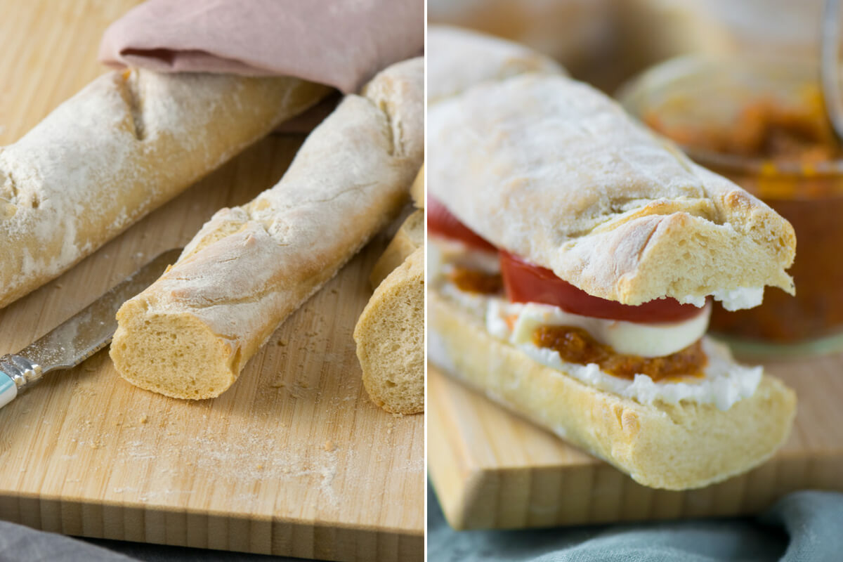 Das Baguette schmeckt super zum Frühstück oder zu Salat, aber auch belegt ist es der Knaller. Nur mit Butter und Salami oder als Sandwich mit Mozzarella, Tomaten und Pesto. Statt Butter verwende ich dann lieber Frischkäse.