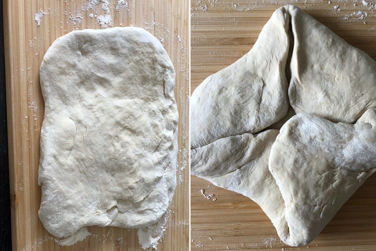 • Den Teig nun erneut durchkneten und anschließend auf einer bemehlten Arbeitsfläche (oder einem großen Brett) zu einem Quadrat formen und falten. Dazu die Ecken wie einen Briefumschlag zur Mitte hin legen und den Teig anschließend umdrehen und erneut 20 Minuten gehen lassen. Dieses Falten 3 Mal wiederholen. Dabei unbedingt darauf achten, dass der Teig nicht mehr geknetet wird.