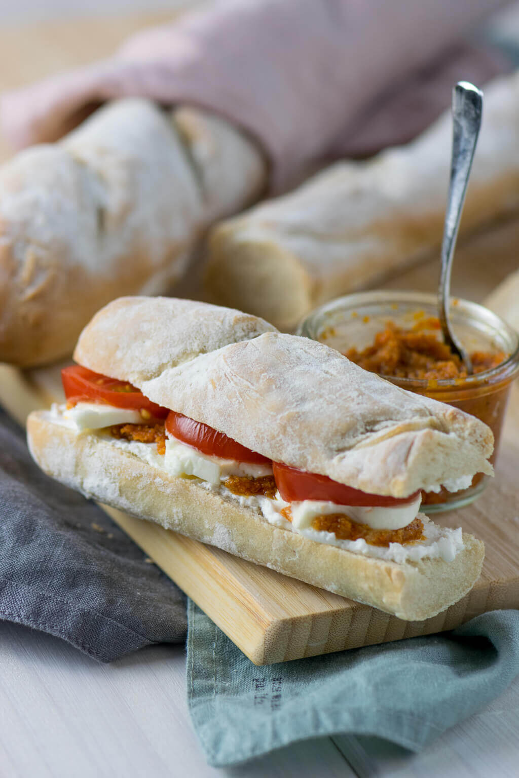 Bei uns gab es somit zweierlei Zubereitungen der frischen Baguettes. Zum einen habe ich es in Scheiben geschnitten und zum Salat serviert. Aber ich konnte nicht anders und habe das Baguette dazu noch lecker belegt: Ganz einfach das Baguette aufschneiden, mit Frischkäse bestreichen und dann mit Tomaten und Mozzarella belegen. Dazu gibt es dann das frische Pesto – fertig ist das super leckere Baguette Sandwich, das auch absolut perfekt als Frühstück oder Mittagessen passt. Ich liebe diese mediterrane Küche einfach!