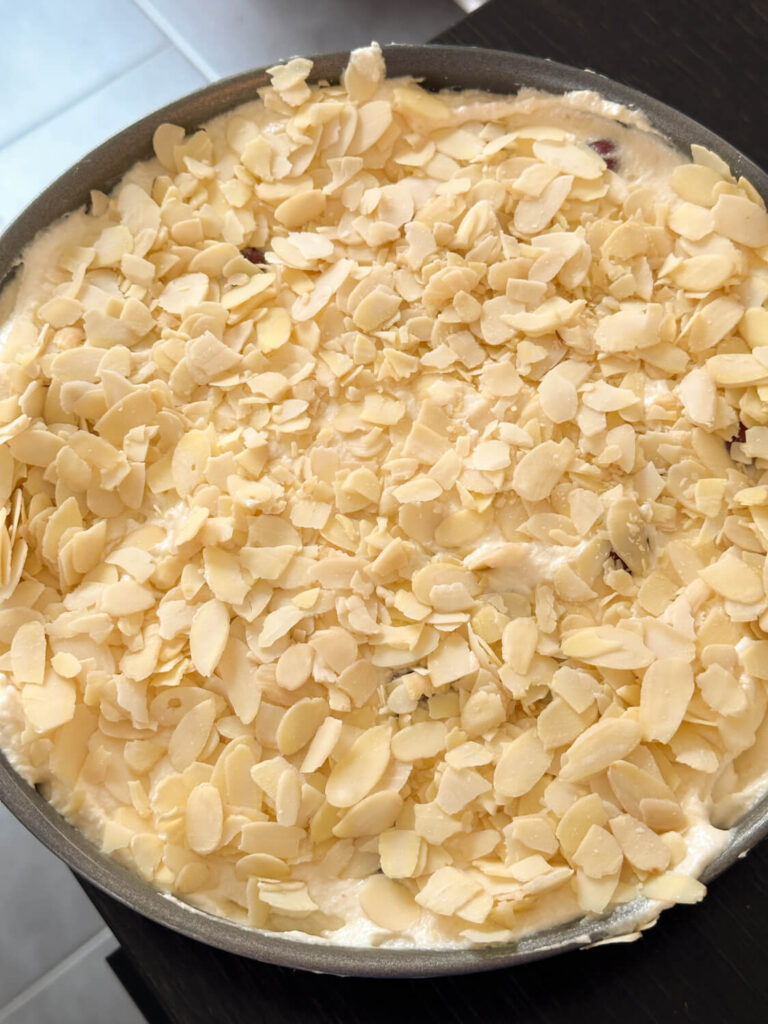- Die fertige Masse in die vorbereitete Springform geben und glatt streichen. Die gehobelten Mandeln gleichmäßig darüberstreuen.